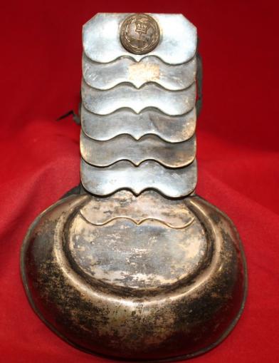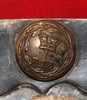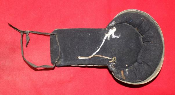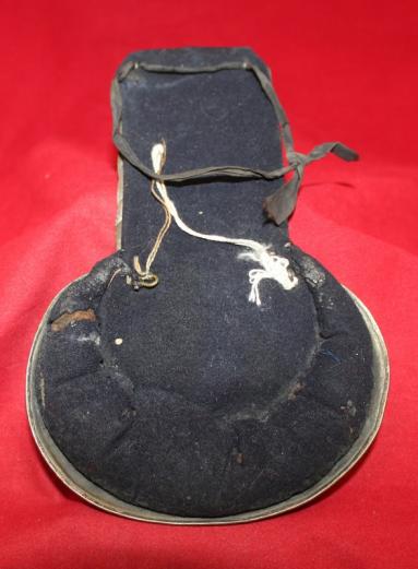 Age toned white metal, showing light wear. With Victorian Crowned 1st Royal Devon Yeomanry button at top. Dark blue padding to back. Very early piece.