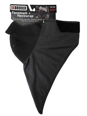 2 in 1 half mask with neck wrap. Neoprene face portion is wind resistant. Medium weight stretch knit is fleece lined and vented for easy breathing. The top is contoured to seal under goggles with an adjustable velcro closure.Black Only.One size fits most.