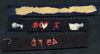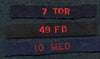 1960s issue, Royal Canadian Artillery Flash lot. 49 FD, 7 TOR, 10 MED, 11mm high number/letters, in red on black, all approx. 5" long, gauze type backing, two with paper and glue residue. All show some age darkening. Note the dark red on the 10 MED.