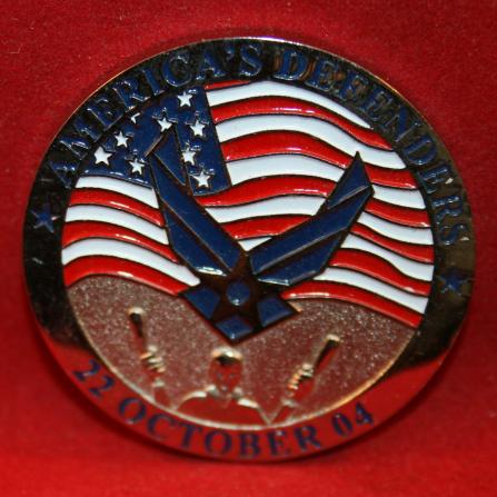 America's Defenders 22 October 04 Challenge Coin. Tinker AFB. Chromed metal with colouring.