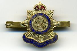 Army Service Corps Sweetheart Pin/Brooch. Brass pin with blue & red enamels. Enamel shows a bit of wear.