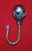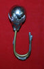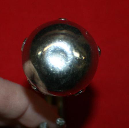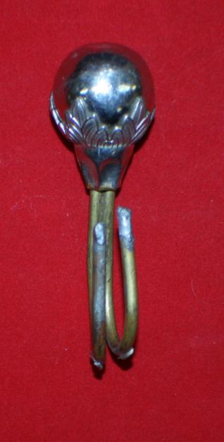 Artillery Helmet (I think) ball, approx. 30mm across, in a floral holder, with brass hooked wires. Ball and holder shiney white metal. It would appear that someone has take and ball and holder and added the brass wires to make a hook. The wires are approx. 4" long and joined with solder. Not sure if you could fix it to work on helmet.