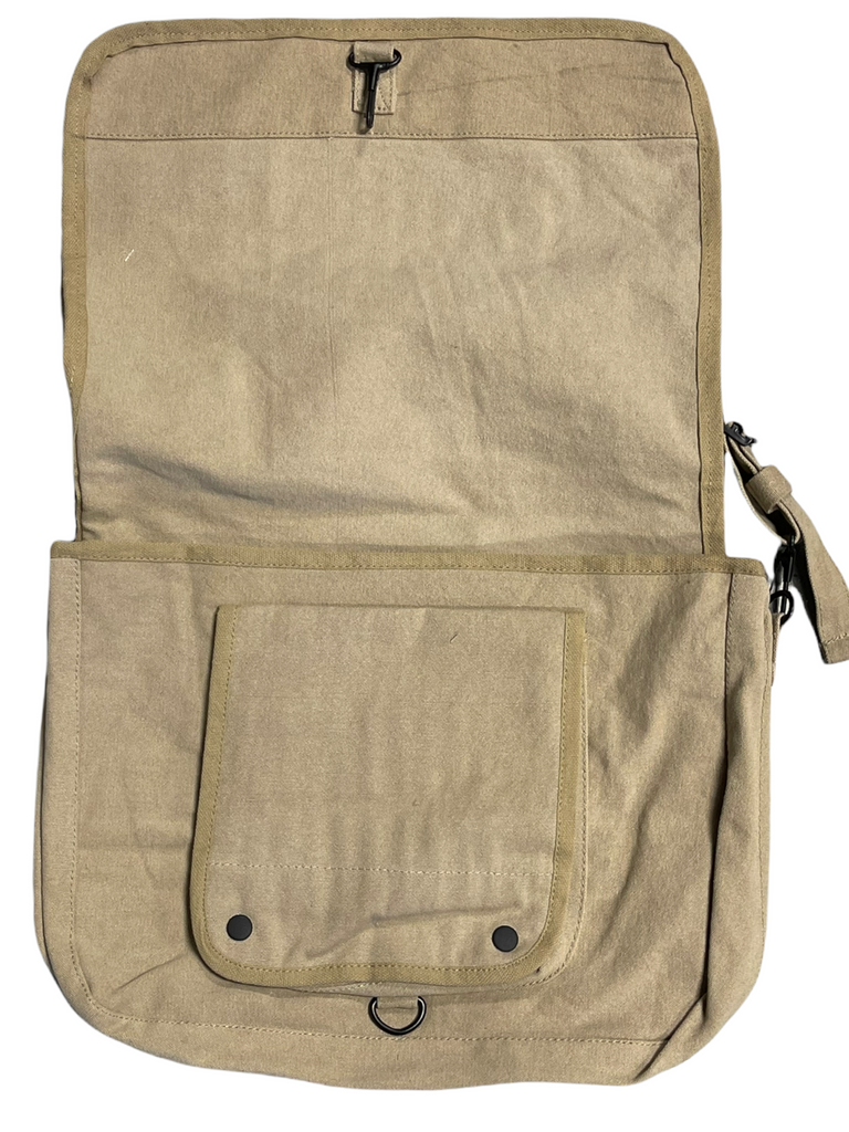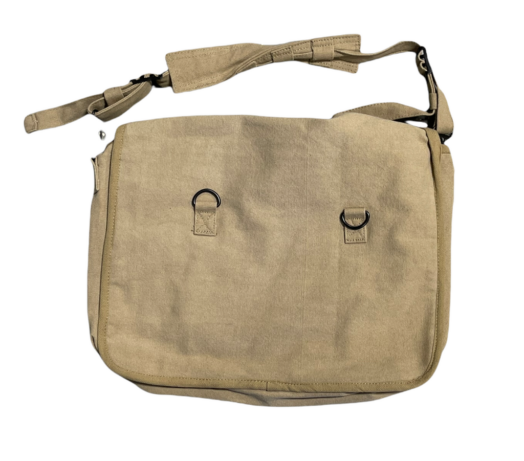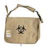 Light khaki canvas colour with black bio hazard symbol. Strap is convertible. Inside pockets.