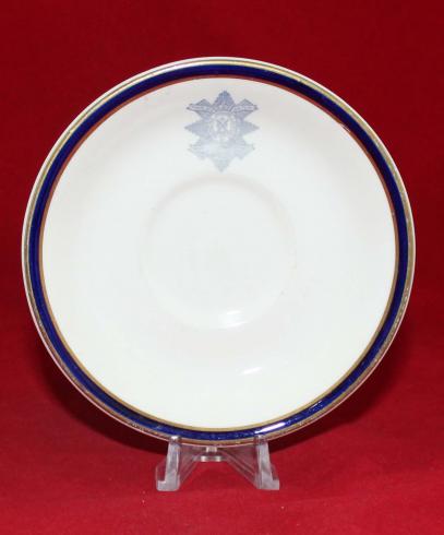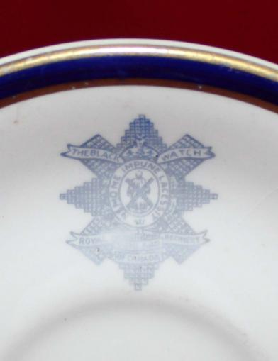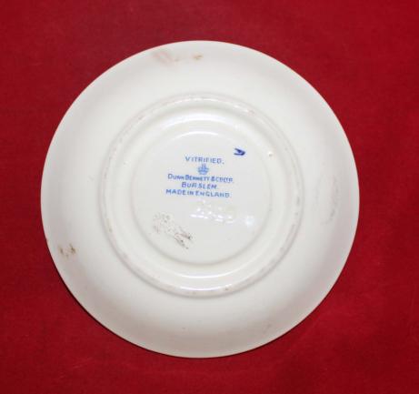 Used to hold a coffee cup. Off white colour with blue regimental crest and blue and gold trim. Light crazing and small crack at upper right of crest. On back Vitrified. Dunn Bennett & Co LTD Burslem Made in England. 4.5" wide.Nice piece of China.