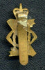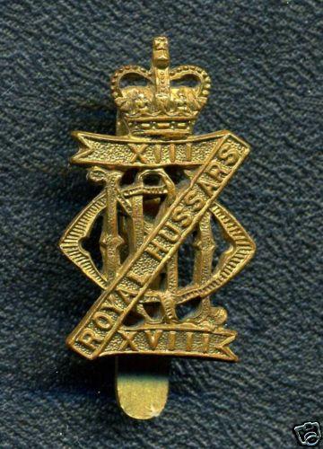 British Army: 13th/18th Hussars Cap Badge. Brass metal. Tiny badge, only 30mm tall.... Slider fastener. Queens Crown, post 1953 issue.