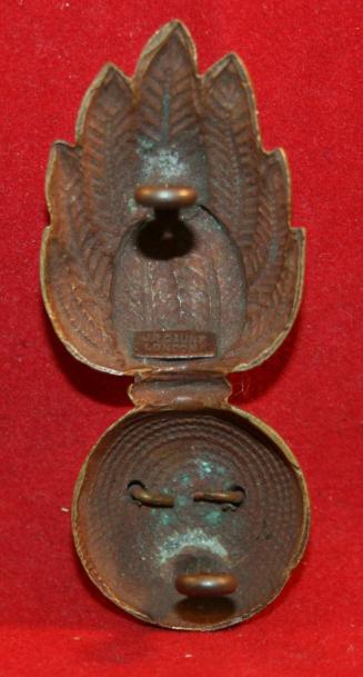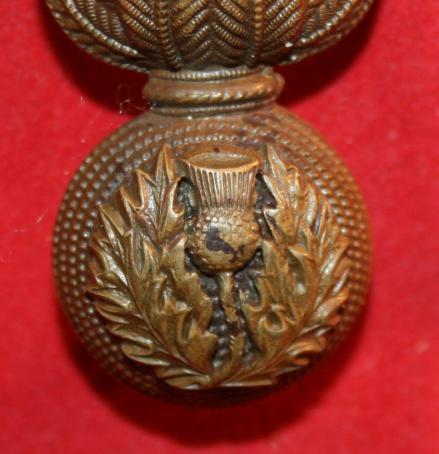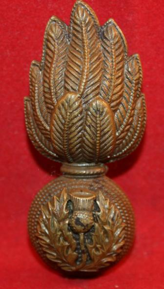 British Army: Royal Scots Fusiliers Collar Badge - OSD (Highland Thistle). Bronze metal. Two piece construction, with thistle attached with fold over wire type fasteners. 58mm tall. JR GAUNT LONDON Tab on the back in the flames. Lug fasteners on the back.