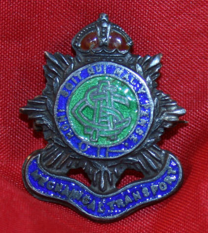 British Army Service Corps, Mechanical Transport Sterling Sweetheart Pin. Silver badge with red, green and blue enamels. Pin back with hook catch. 27mm tall.