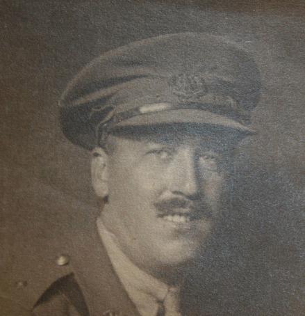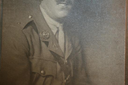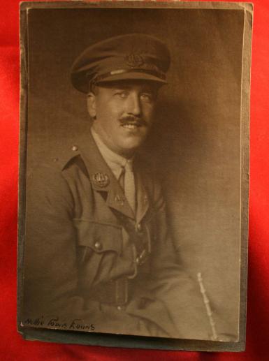WW1 era, Photograph, 4" x 6", mounted on cardboard backing. Showing a Leiut, one rank pip, wearing soft floppy hat with cap badge of the DORSETSHIRE REGIMENT. He has collar badges of the Dorsetshire Regt and below that the trade badge of the Pioneer Branch, Crossed Pick and Hammer. Wearing Sam Brown belt, holding bamboo swagger stick. In ink, bottom left word, NELLIE POWIS EVANS