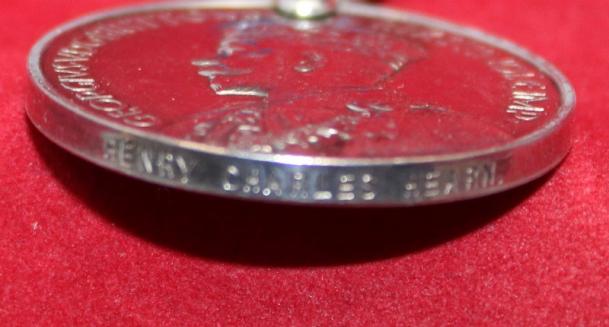 Polished silver medal, with ribbon. Impressed along edge: HENRY CHARLES HEARN. No other research completed.