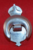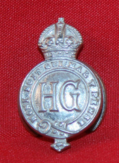 The British HG, Home Guard members pin. Kings Crown dull silver plated, Latin motto on outside buckled banner with HG centre. Button Hole fastener, 26mm x 17mm.