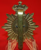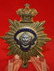 BRITISH LEGION, Bandsmen Cap Badge. Dull gold gilt metal, with a blue enamel banner, with words BRITISH LEGION on it and a silver Lions Head in centre. Slider fastener. 35mm high by 28mm wide. Shows some age dulling but still excellent looking piece.