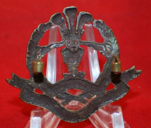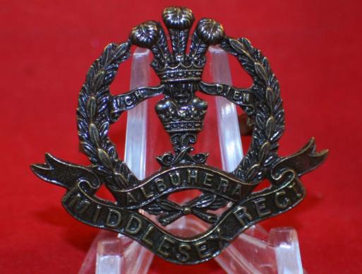 British, Middlesex Regiment Cap Badge, Officers - Bronze. "Albuhera" banner. Bronze metal. Tang fasteners, folded over to make loops.