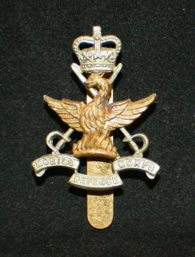 British, Mobile Defence Corps Cap Badge. White metal Queens Crown and bottom banner and dull gold Phoenix, slider fastener. 3.34mm high by 28.15mm wide. Could have been worn on Beret. Nice stamping. KK2160.