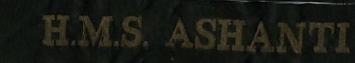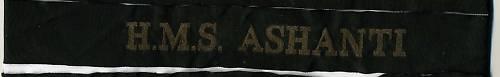 British Navy, Cap Tally: H.M.S. ASHANTI. Not tied. 28 inches long. Shows creasing to ribbon, has no rips or tears.