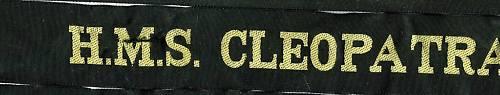 British Navy, Cap Tally: H.M.S. CLEOPATRA. Not tied. 31 inches long. Shows creasing to ribbon, has small tear in letter "M" of HMS.