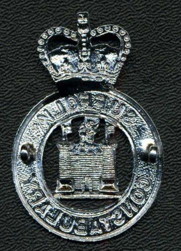 OBSOLETE, British, SUFFOLK CONSTABULARY Cap badge. Chrome. Queens Crown. With voided Castle, overlay. Two lugs. Larger than usual, 49mm wide by 58mm high, nice.