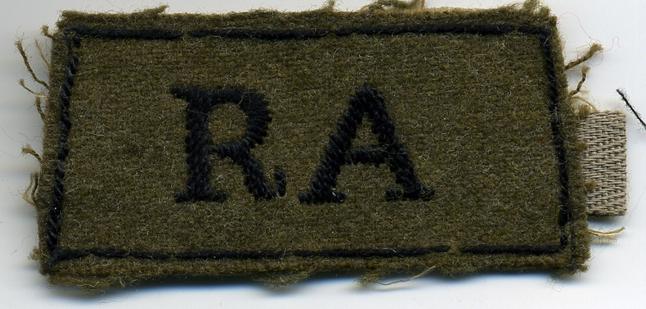 British: RA (Royal Artillery) Slip on Title. Black on khaki. Cloth tab on reverse.