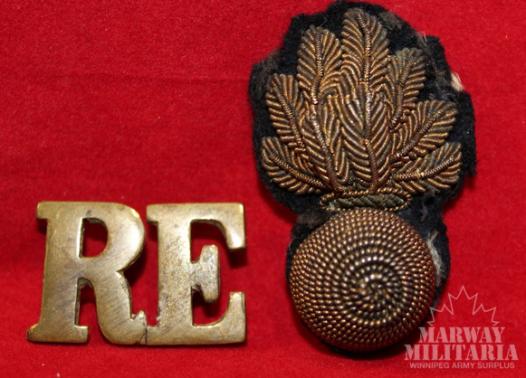 Brass metal RE with early rectangular fasteners. Gold wire padded flaming grenade collar badge.