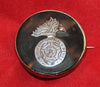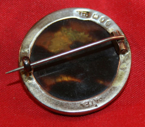 British, Royal Fusiliers, Sweetheart Pin. Round Sterling Silver case, with likeness of the Fusilier badge on Shell backing. Case 1 1/16" across, pin back, marked, SBRS Lion/Cat Head/a and PATEN. on back. Excellent well made piece.
