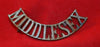 British: Shoulder Title Badge: MIDDLESEX. Age toned brass metal. Lug fasteners on the back, one remaining.