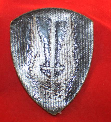 Shield shape in black felt with toned yellow Upswept Wings/banner with white thread Sword, detailed in black thread and word OSONS in black on the banner. Clear plastic type backing. Not worn condition.