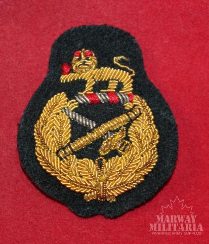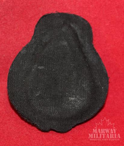 Post 1953 issue. A nice age toned gold wire. Lion holding maple leaf. Padded. 5cm tall by 4cm wide. Paper residue on the back.
