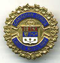 Heavy gold plated pin, Maple Leaf outer wreath with words, CANADIAN CORPS LADIES AUXILIARY on blue enamel banners and a colored enamel COAT OF ARMS shield design, pin back. Excellent well made pin. No maker marks. Kings Crowned, pre 1952 issue. 30mm tall.