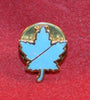 This pin, Maple Leaf shape, 14.24mm high by 11.43mm wide, clutch pin fastener, blue enamel on gold plate. Excellent.