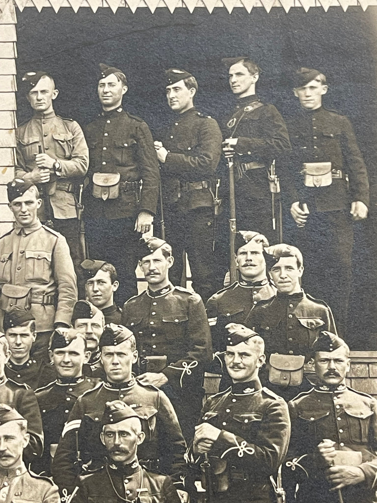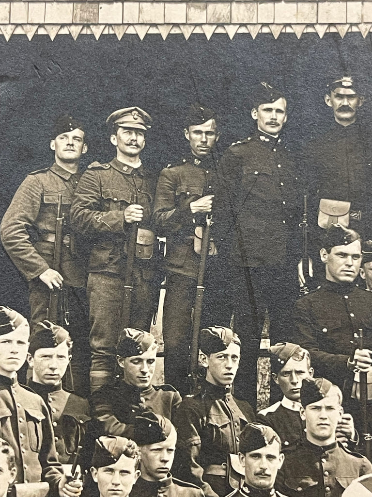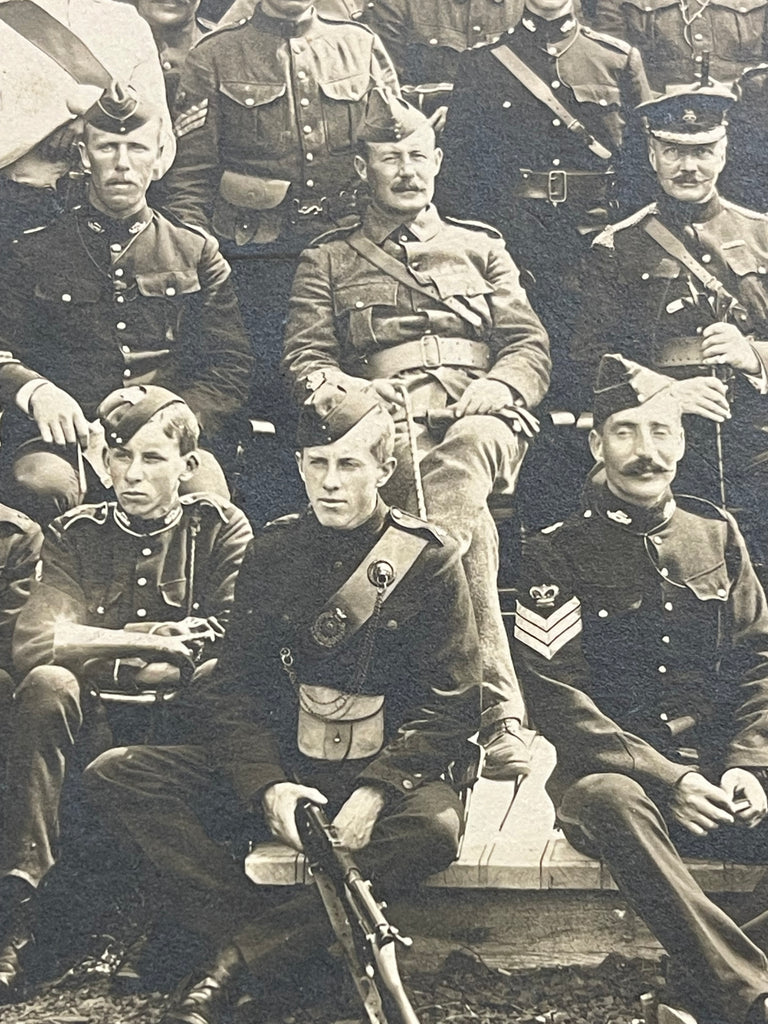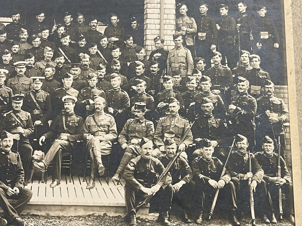 An original matted photograph of the Rockliffe Rifle Range, Canadian School of Musketry, July & Aug Ottawa 1903. Shows many different regiments seated and standing. Picture was taken by Pittaway Ottawa. Matte shows some wear and staining near top.Excellent and clear with magnifier (or perhaps you have better eyes than me). Great uniform details. Approx 14"x 12"