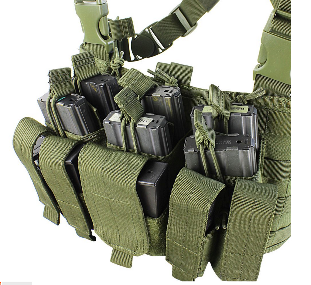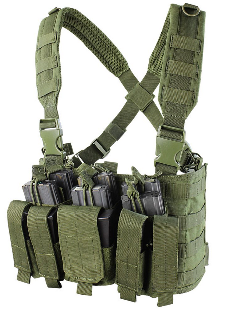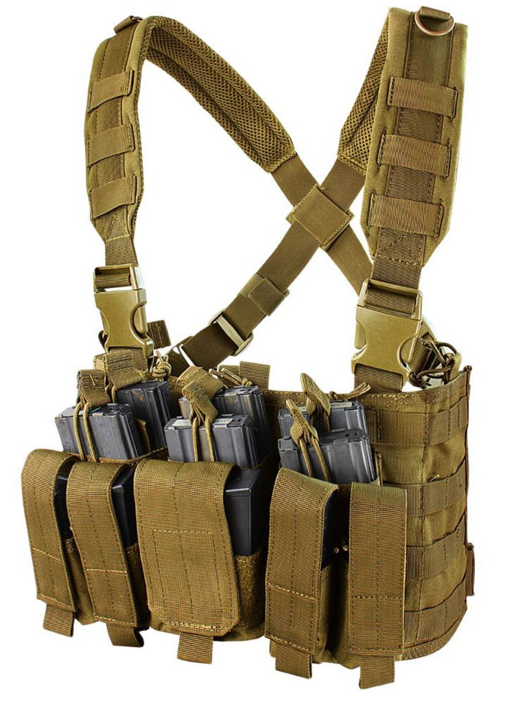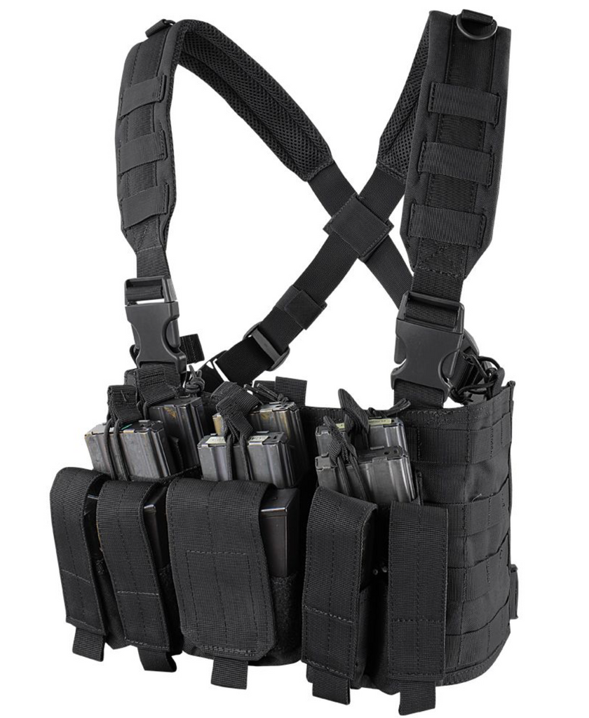 The Condor Recon Chest Rig is designed with built-in stacker/kangaroo style mag pouches to allow the user rapid, seamless access to mags for faster reloads with up to six AR/M4 mags and six pistol mags. The adjustable and removable flaps on the pistol pouches also allow the user to keep a knife, multi-tool, or other small accessories close at hand while training or on duty. This Condor Recon chest rig setup also features an interior mesh pocket for safely storing items close to the body. Swivi-Lockster quick-release buckles allow you to remove the chest rig quickly and easily when necessary. With grommets for drainage and padded cross-back shoulder straps, this Condor chest rig also helps you stay comfortable and dry. Clips not included.