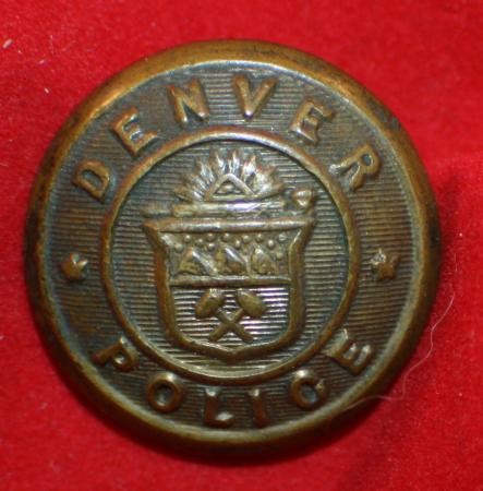 Denver Police Uniform Button - Old Obsolete style / design.Beginning to show age toning to gilt brass metal. Loop on the back. 22mm wide. Maker stamped JR GAUNT & SON INC NEW YORK MADE IN ENGLAND.