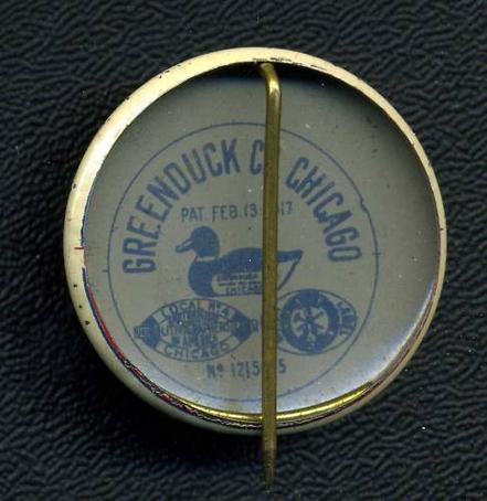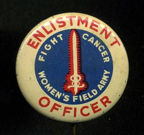 White tin button pin. 37mm across. Words on white, ENLISTMENT OFFICER, in red and on blue centre, FIGHT CANCER WOMEN'S FIELD ARMY in white, with red and white Flaming SWORD centre design. Words on back of pin, Greenduck Co. Chicago, with duck trade mark. Pin back.