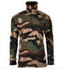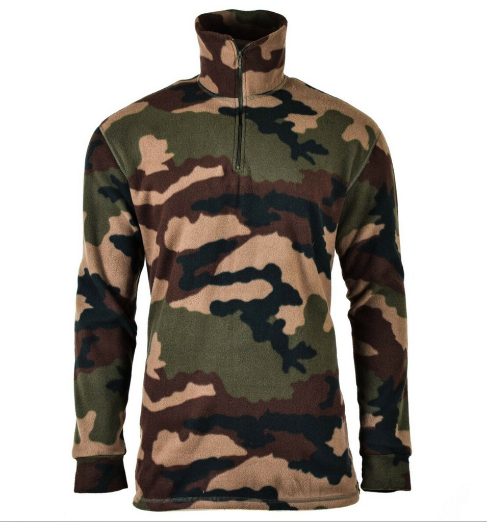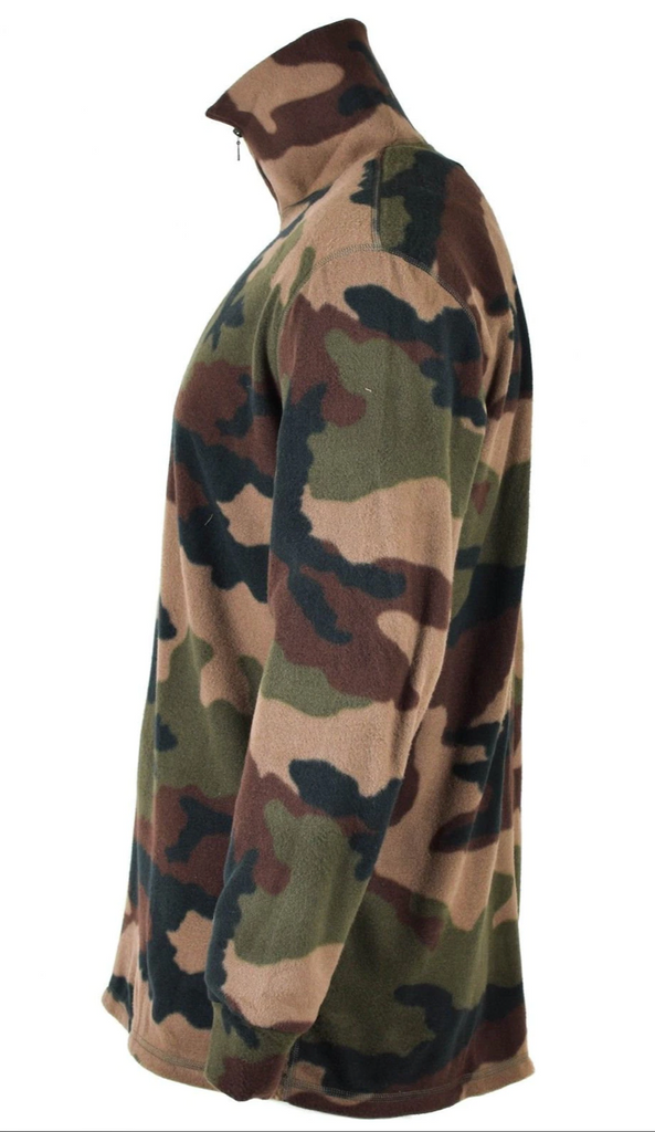 This is a very soft polyester fleece quarter-zip sweater. It is made to be an insulating layer for the French forces in cold conditions, so it should work perfectly for our cold Canadian winters too. Woodland camo pattern and a zippered collar to cover the neck. It can be worn zippered down to make a collar or zipped up as a neck warmer.  Genuine Military Surplus and New in Package! Marketed as European XL (112) & 2Xl (120), these fit little smaller, so we have them listed as Large & XL.