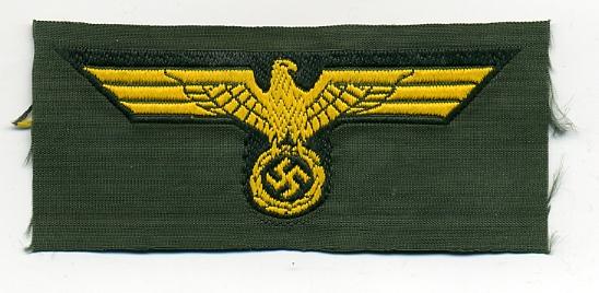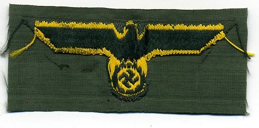 German Navy Eagle, Coastal Artillery. Yellow Eagle, 62mm wing tip to wing tip, on dark green all on pale green rayon base, near mint.