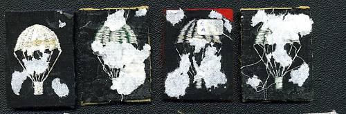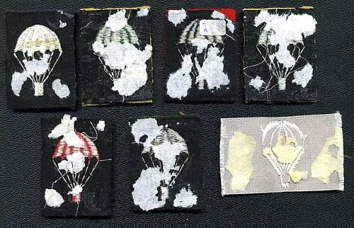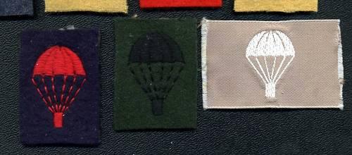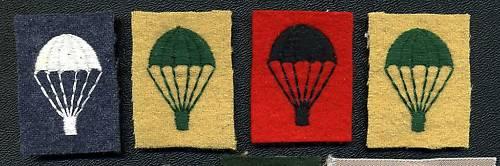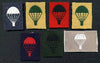 Group of 7, Parachute square Patches from the UK (Para). Non airborne units. Thread colors are: 2 green on tan, white on airforce blue, black on redm black on green, red on dark blue, and white on tan embroidered. The cloth insignia has glue & paper residue on the back.