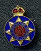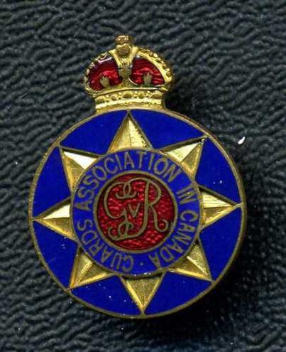 Kings Crown in dull gold with red enamel in it over circle, 20mm across, with blue enamel backing, 8 point Star with circle banner with words, GUARDS ASSOCIATION IN CANADA onm blue enamel and GVR on red enamel. Single Screw post. BIRKS maker marked. Well done.