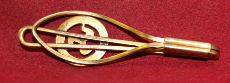 ISLE OF MAN, Tie Bar. 3 mailed legs in a circle mounted to a clip type bar. Heavy gold plated, no markings as to maker or metal. 13.96mm across. Bar 52.62mm wide. Nicely made.
