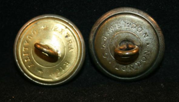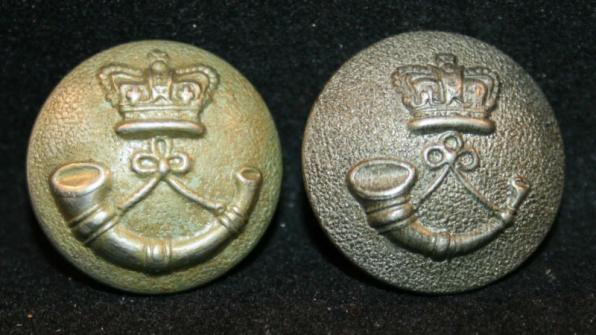 LIGHT INFANTRY Uniform Button Lot. Lot of 2. Both Victorian Crown over Horn. 1 - White metal, 23mm, EXTRA RICH maker. 1 - 23mm, gray pebbled coated, WELDON maker.