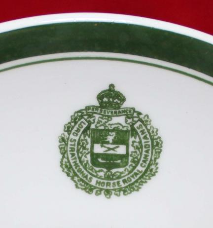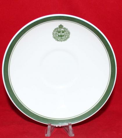 Used to hold a coffee cup. Off white with green regimental crest and border. Marked Apsley Pellatt & Co LTD Cheapside London EC2. Nice piece of China. 5.5" wide. Shows light wear, no cracks or crazing.