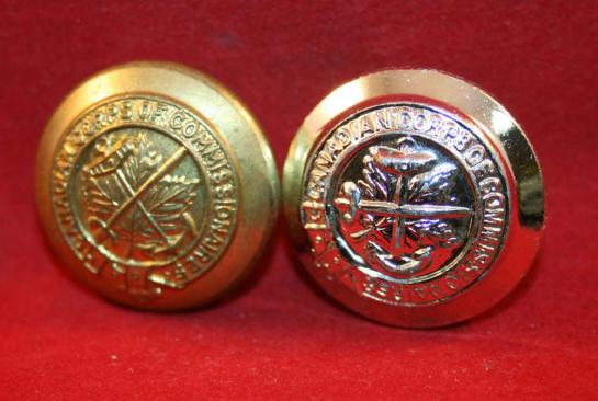 Lot of 2, Canadian Corps of Commissionaires Uniform Buttons. On in brass, one anodized. Each with loop on the back, and maker stamped. 25mm wide.