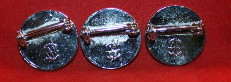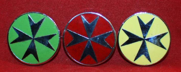 Lot of 3, St. John's Ambulance Junior Efficiency Badge / Special Service Pin. Green 1st Grade, Red 2nd Grade, yellow 3rd Grade. White chrome with coloured enamel. Pin back locking catch. Each maker stamped. 22MM wide.