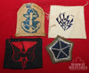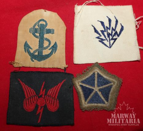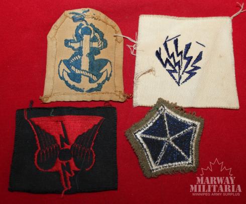 Lot of 4. 1 - Age dull, almost brown, Seaman's flash, light blue Anchor and tam white cloth backing. 2 1/4" x 2 3/4". 1 - Red Wings with a circle centre and Lighting Bolts through ball, red on black, square, 2 3/4" x 2 1/4". 1 - age dull white square, 2 3/4" x 3", with 5 light bolts coming to a point at the bottom and fanning out. 1 - USA, V Army, 5 sided design in and dulled white with 5 spokes with blue cloth inside, on khaki, age darkened.