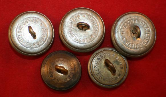 Lot of 4, South African Natal Carbineers Uniform Buttons. 4 White metal, Kings Crown. 1 age toned silver metal, with fancy design along edge. Each with loop on the back, 4 Hobson marked. 3 x 25mm wide, 1 x 22mm wide. 1 HERBET & CO 22mm wide.