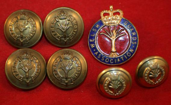 Lot of 7, Welsh Guards Uniform Buttons & Sweetheart Pin. Lot consists of, Welsh Guards Association, Enameled sweetheart pin, with pin back and hook catch. Post ww2, with Queens Crown. 4 Kings Crown Brass, uniform buttons 21mm with with loop on the back. 2 Queens Crown uniform buttons, loop on the back, bright brass. 16mm wide.