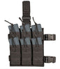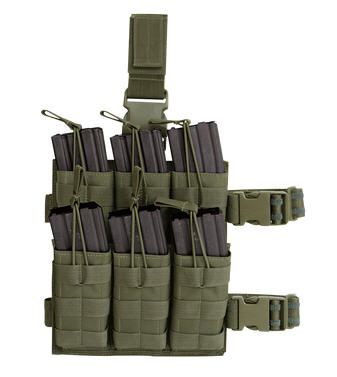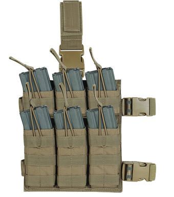 Allows convenient carry for six 30 round M4/M16 magazines. Quick-release belt strap with plenty of PALS webbing. Adjustable and removable thigh straps. Two rows of non-slip rubber backing and quick-release buckles. Hook-n- loop pocket for pistol or ammo. Magazines not included. One size fits most. Approx. Overall Measurements 9”L x 2”W x 11”H.