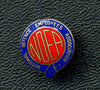 WW2 era pin. Round gold metal pin, 17mm across, screw post fastener with nut. Words, NATIONAL DEFENCE EMPLOYEES ASSOCIATION, on blue enamel around outside and letters NDFA on red enamel centre. Maker, BREADNER CO/OTTAWA and UNION S MADE. Nice.