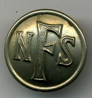 NFS, National Fire Service Uniform Button. White metal with loop on the back. Maker stamped JR GAUNT & SONS LONDON. 25mm wide.