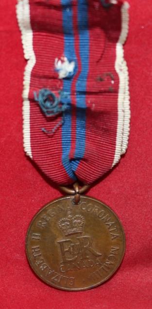 Medallion with drilled hole ring and ribbon added. Interesting converted piece. These medallions were given to children during the 1953 Coronation.