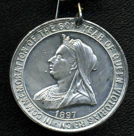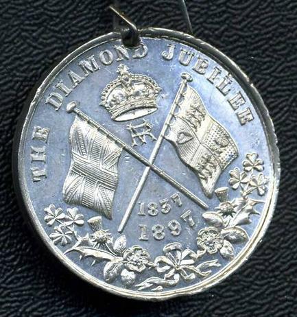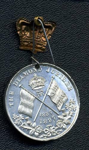 Round Medallion, 40mm across, Silver or heavy Silver plate. Has a copper/bronze Victorian Crown/pin attached to top. On front words, In Commemoration of the 60th Year of Queen VICTORIA'S Reign, on outside banner with side profile of the Queen and date 1897 under it. On the other side, words, The Diamond Jubilee 1837 1897, with a Kings Crown/Crossed Flags and Leaf Wreath. Shows some wear to high points and slight scuffing and small scratches but still excellent.
