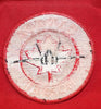 Round,3 3/4" across, white gauze type cloth back. Shows some glue residue on the back. Slight age darkened.